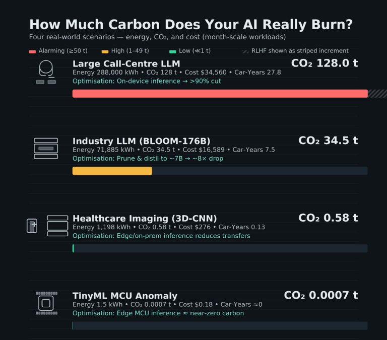 AI workloads are not just compute-intensive, they’re carbon-heavy. And depending on where and how your models run, the climate cost can range from negligible to alarming. To help teams see what’s under the hood, we audited four real-world scenarios: from sprawling server farms powering mega-LLMs to the microscopic energy draw of TinyML on microcontrollers.